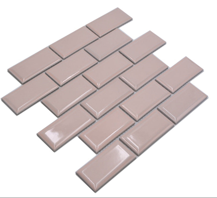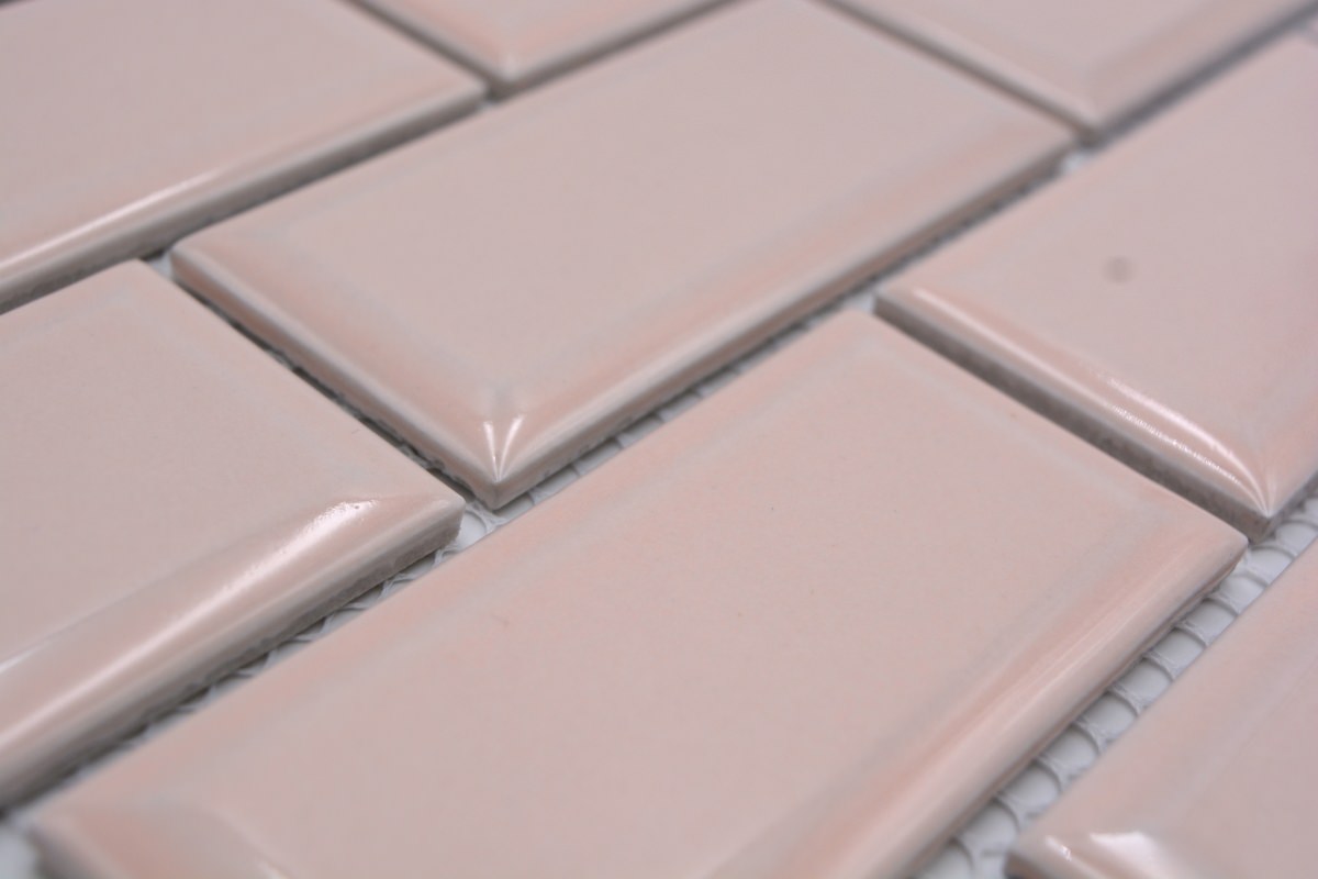 Metro Pink Glänzend Mosaikfliesen aus glänzender Keramik auf Netzmatten 295,5×291 mm. Die rechteckigen Steine sind 45×95×6,5 mm, werden mit 2 mm Fugen verlegt und eignen sich für Wand und Boden, im Innen- wie Aussenbereich.
