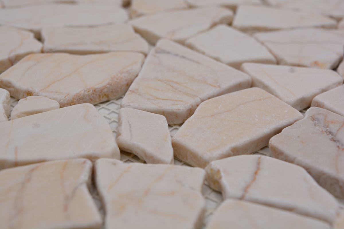 Die Mediterran Beige Bruch Kieselstein Marmor Mosaikfliese bringt natürliche Schönheit in Häuser und Öffentlichen Orten. Die unregelmässigen Steinformen in warmen Beigetönen schaffen ein lebendiges Muster, das jeden Boden und jede Wand zu einem besonderen Blickfang macht. Mit seiner matten Oberfläche und einer variablen Fugenbreite von 0–15 mm fügt sich das Naturstein Mosaik in klassische wie auch moderne Wohnstile ein.