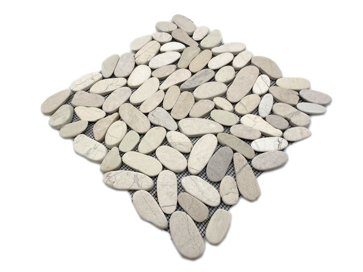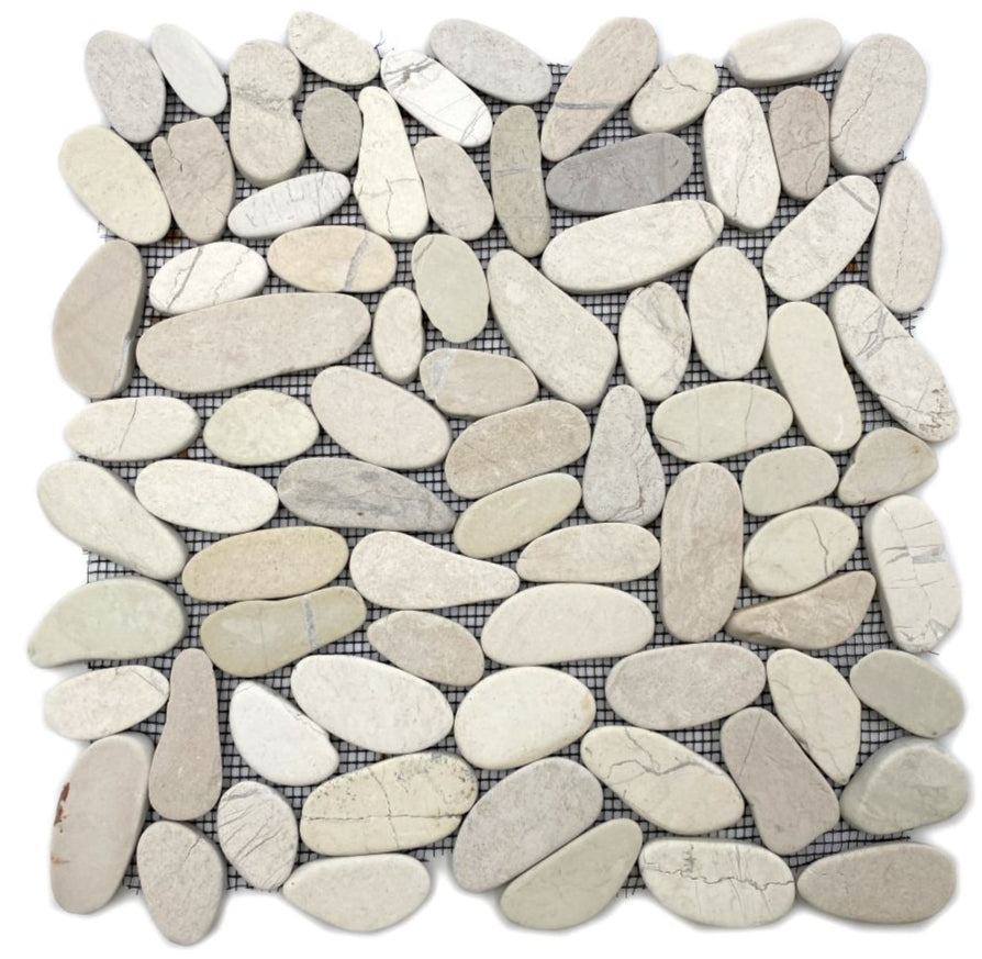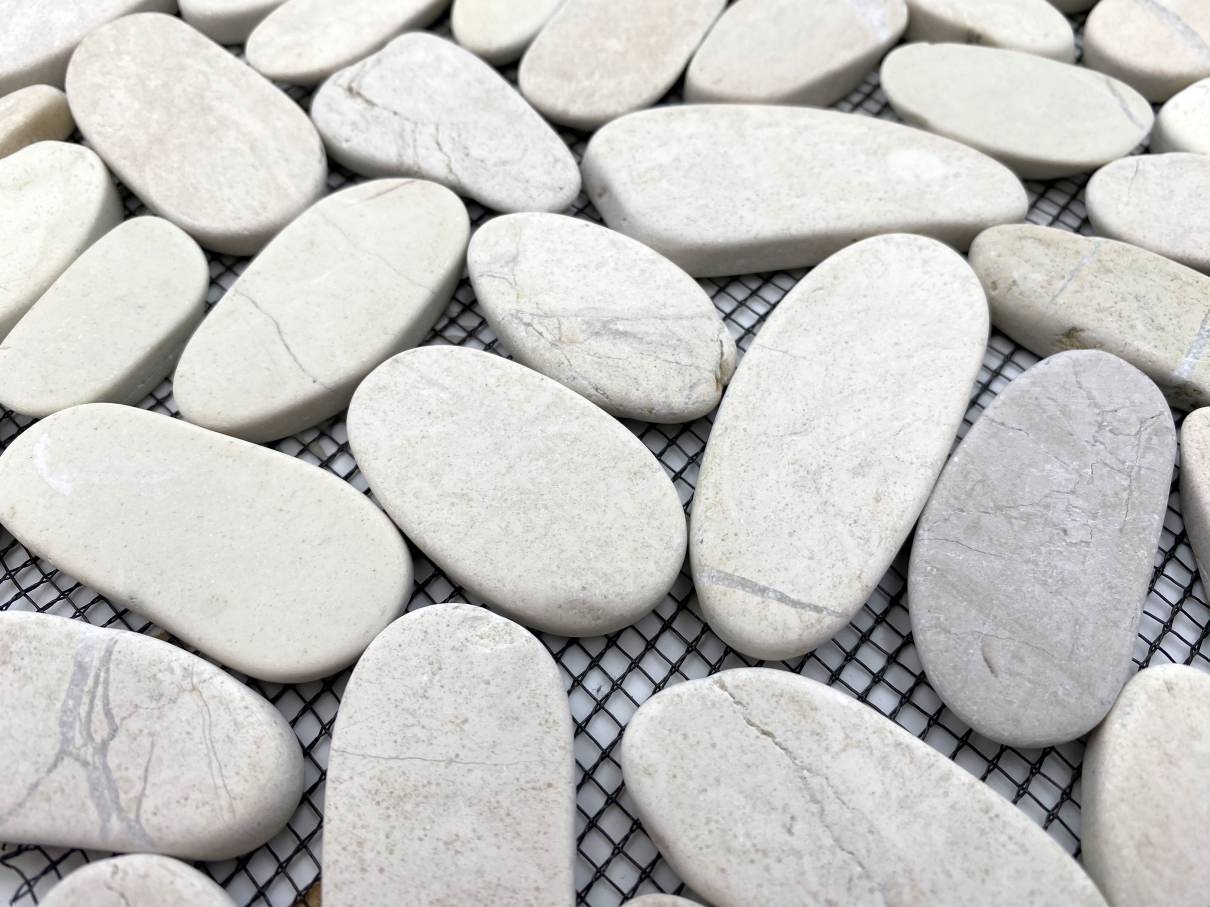 Die Weiss Flusskiesel Matt Kieselstein Mosaikfliese aus weissen Flusskieseln bringt ein Stück Natürlichkeit und Ruhe in jeden Raum. Die ovalen Steine in unterschiedlichen Grössen zwischen 30 und 70 mm sind auf einer 305 x 305 mm grossen Netzmatte angebracht und lassen sich dank einer Fugenbreite von 3,0 mm einfach und präzise verlegen. Die matte Oberfläche unterstreicht die authentische Kieseloptik und sorgt für eine angenehme Haptik, die besonders barfuss ein natürliches Laufgefühl vermittelt.